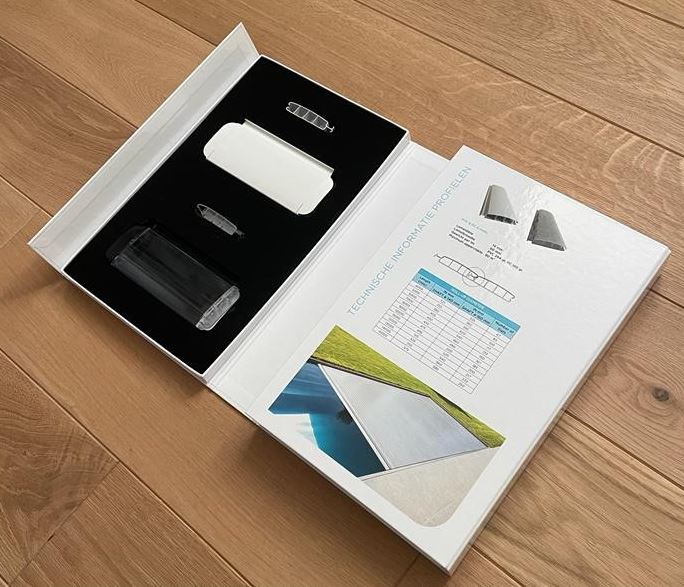 Pool Cover Systems wil stalen in één oogopslag kunnen presenteren. De klant moet de stalen niet alleen kunnen zien, maar ook in handen kunnen nemen. Het resultaat: een handige drieluik stalenmap met uitneembare stalen. De stalen zitten lichtjes geklemd in de beschermende mousse, daardoor zijn ze makkelijk uit de inlegtray te halen en terug te leggen.